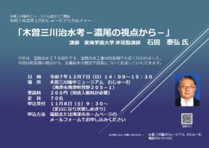 今年は宝暦治水完工270周年です。宝暦治水は尾張側でも広く行われました。今回は尾張藩の視点から、宝暦治水の歴史や意義についてお話していただきます。 講題 「木曽三川治水考-濃尾の視点から-」 講師 東海学園大学非常勤講師 […]